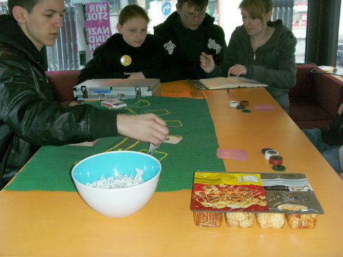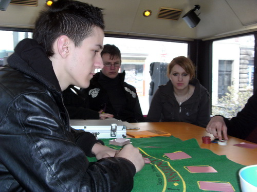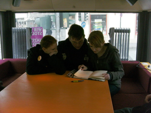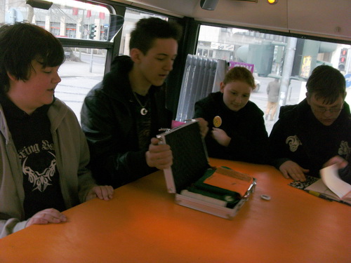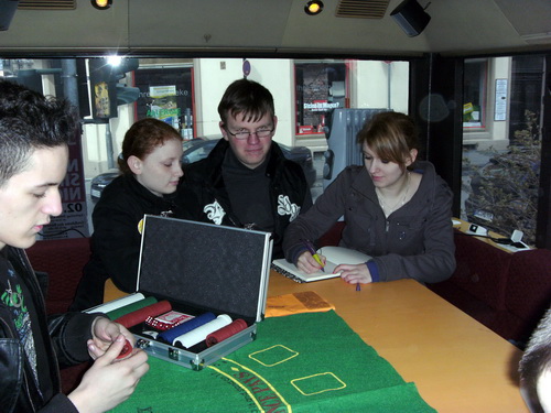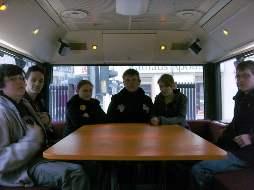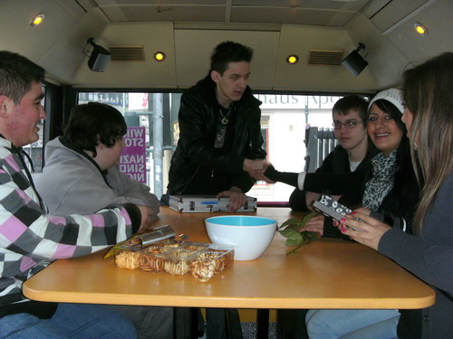 Im Bus kann man Gesellschaftsspiele machen, Ball spielen, ins Internet, Bewerbungen schreiben, kochen, grillen, essen... Außerdem gibt es eine Wii-Konsole, DVDs, eine Leinwand, Spiele und noch viel mehr.