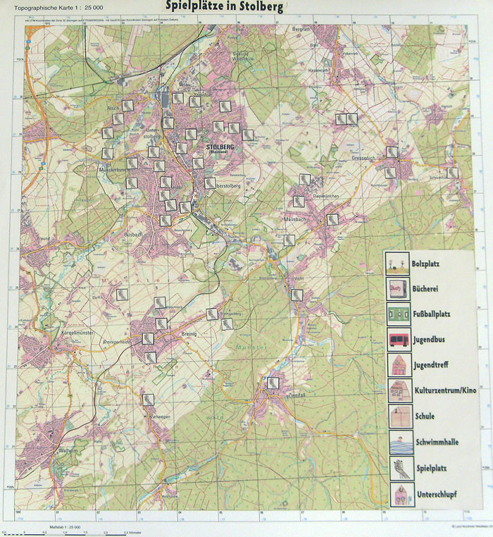 In Stolberg soll es 53 Spielplätze geben. Allerdings sind ein paar auch nicht mehr da. In Büsbach gibt es keinen einzigen Spielplatz mehr. Besonders schön sind die Spielplätze "Am Wimblech" in Mausbach, "Am Dorfweiher" in Dorff und "An der Waldschenke" am Breiniger Berg. Der Spielplatz am Breiniger Berg liegt wunderschön mitten im Wald. Da kann man alleine leider nicht hin. Aber es lohnt sich für einen Ausflug.
